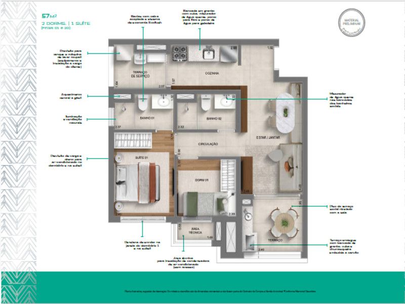 - Plantas de 66m² com 3 dorms (1 Suíte)