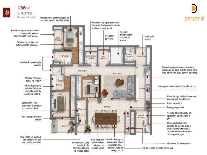 - Plantas de 136m² com 3 suítes